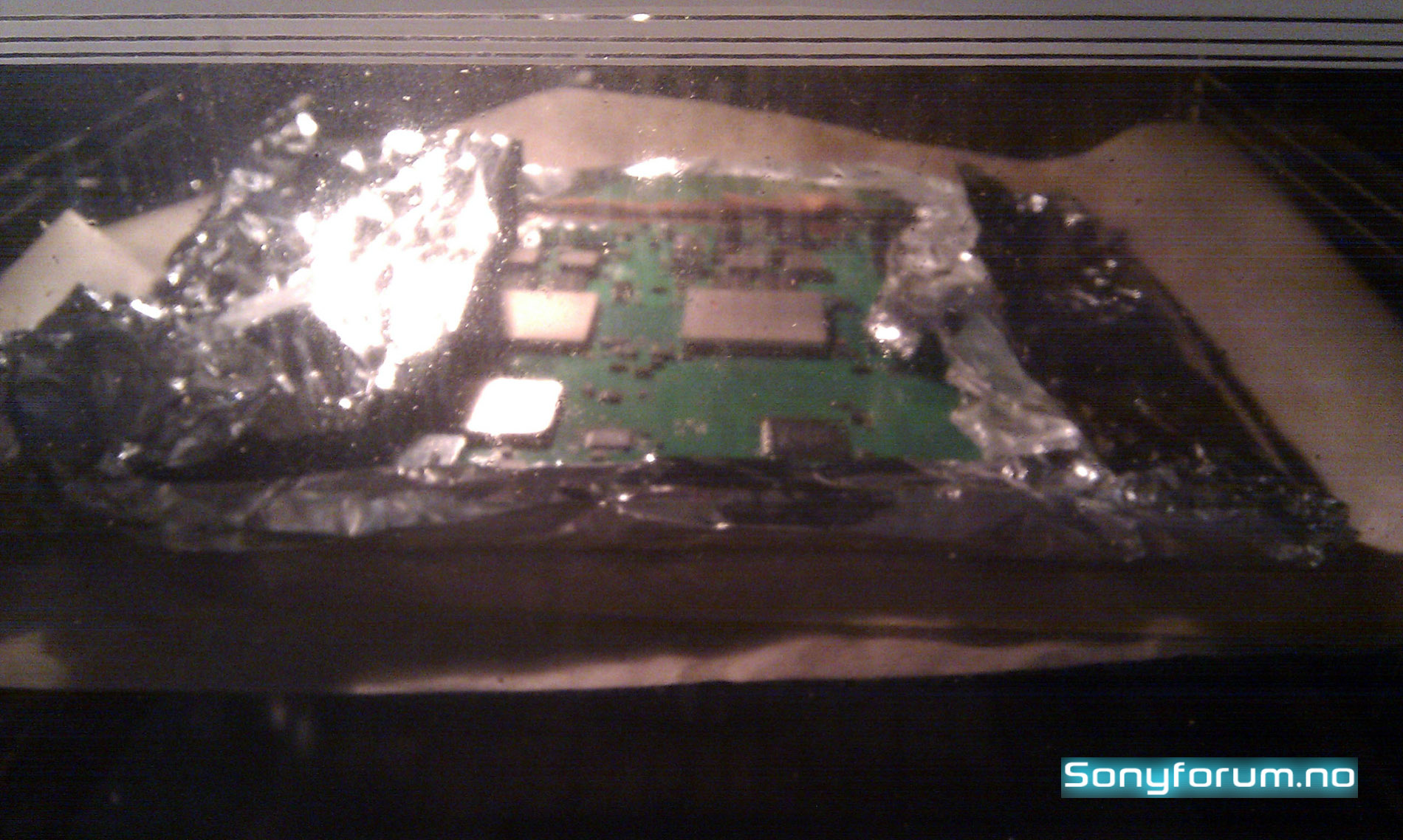 Jeg har tidligere reparert dette for kompiser ved å gjøre en såkalt "reflow". Dvs. at man bruker en varmepistol å fokuserer varmen på prosessoren og skjermkortet sånn at loddepunktene under fester seg på nytt. I går fant jeg ikke varmepistolen så derfor tenkte jeg nytt; nemlig å putte hele hovedkortet i ovnen.